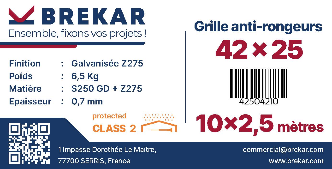 Paquet de 10 barres de 2,5 m de grille anti-rongeur en 67 mm de large, pliées en cornière de 42 x 25 mm